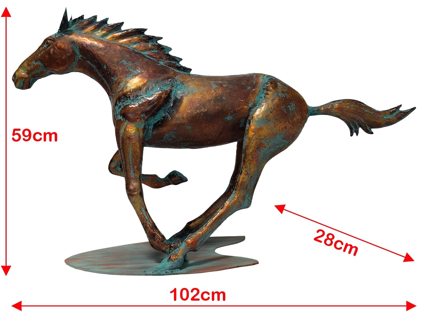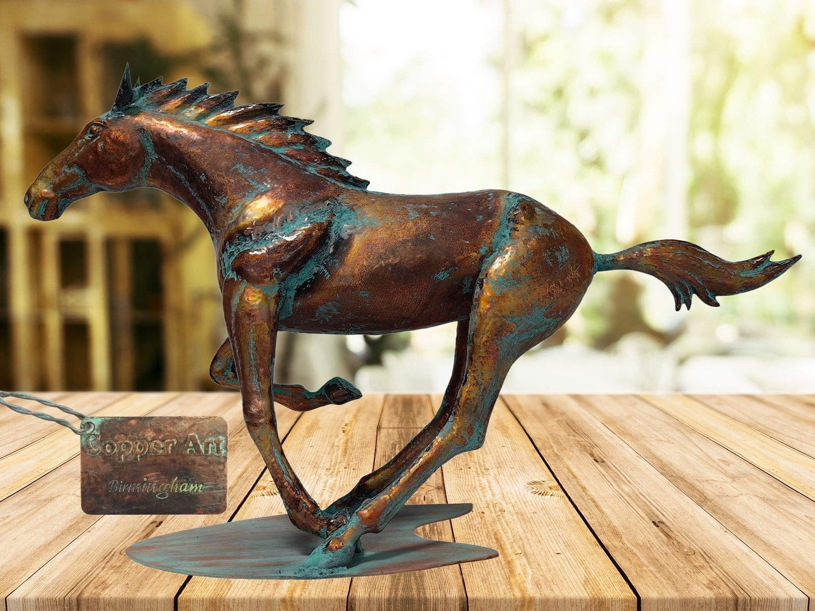Make a bold statement with this 102cm Giant Horse Statue, crafted in a striking aged copper finish with verdigris patina. The dynamic 3D form captures the power and movement of the horse, while the rich weathered tones add an elegant, sculptural feel. Mounted on a heavy metal base for stability, this impressive piece is perfect for luxury interiors, statement gardens, or commercial spaces seeking an eye-catching focal point.