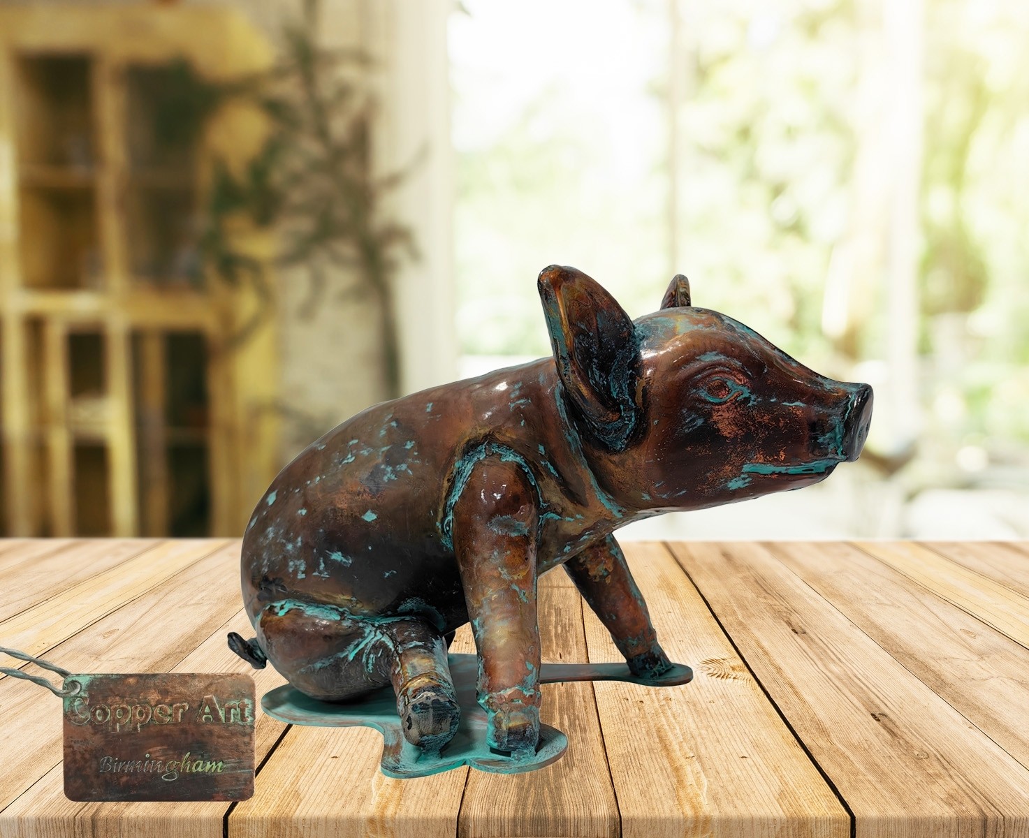 48cm Aged Copper/Verdigris Finish 3D Sitting Pig Statue On Heavy Metal Base