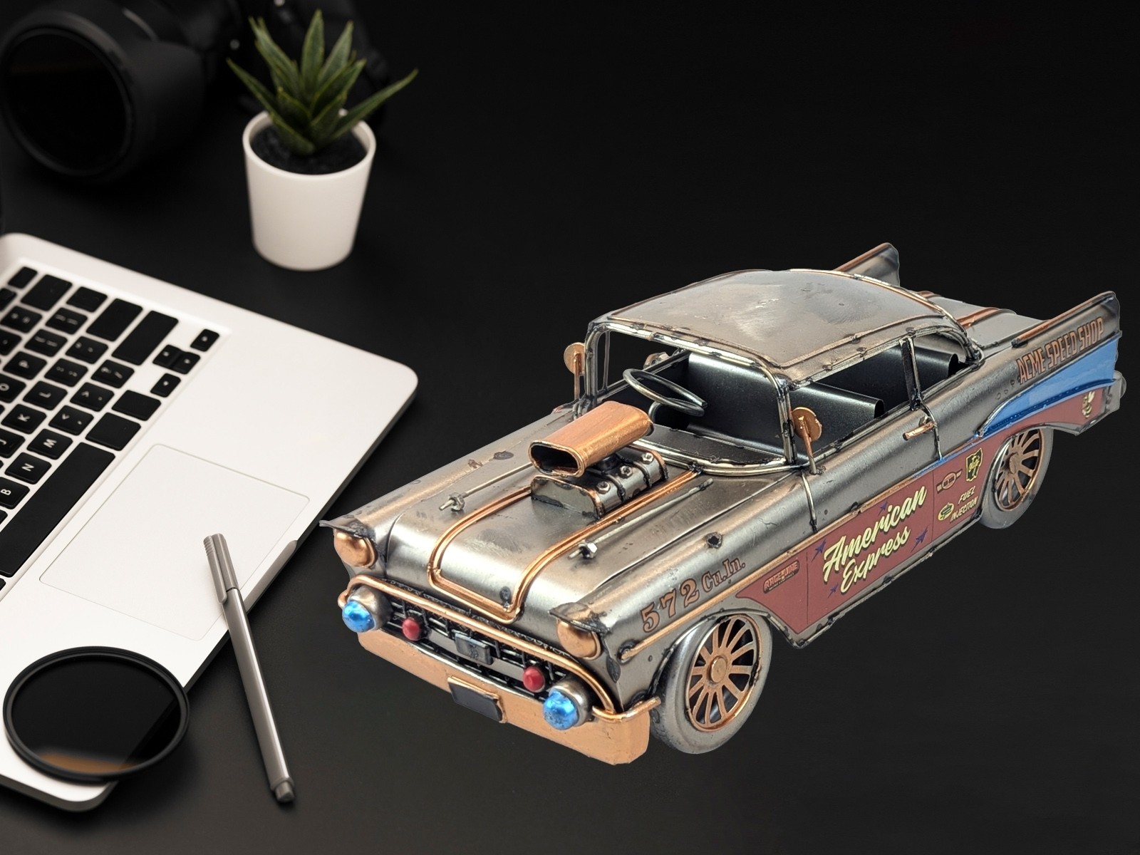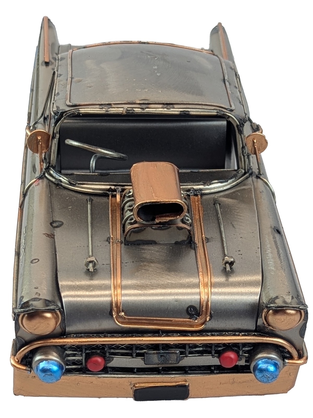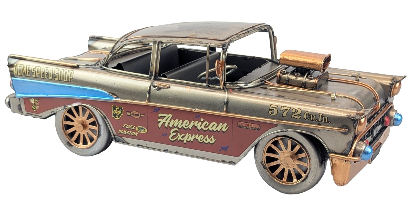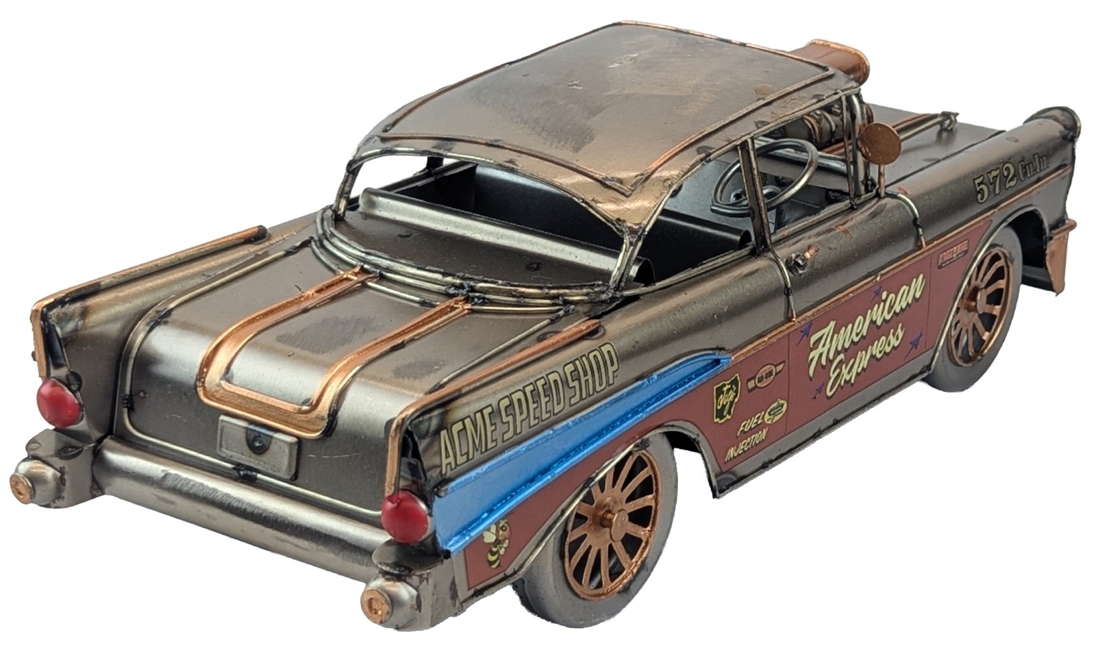 A tin plate retro model decorative 50s Car in polished metal.