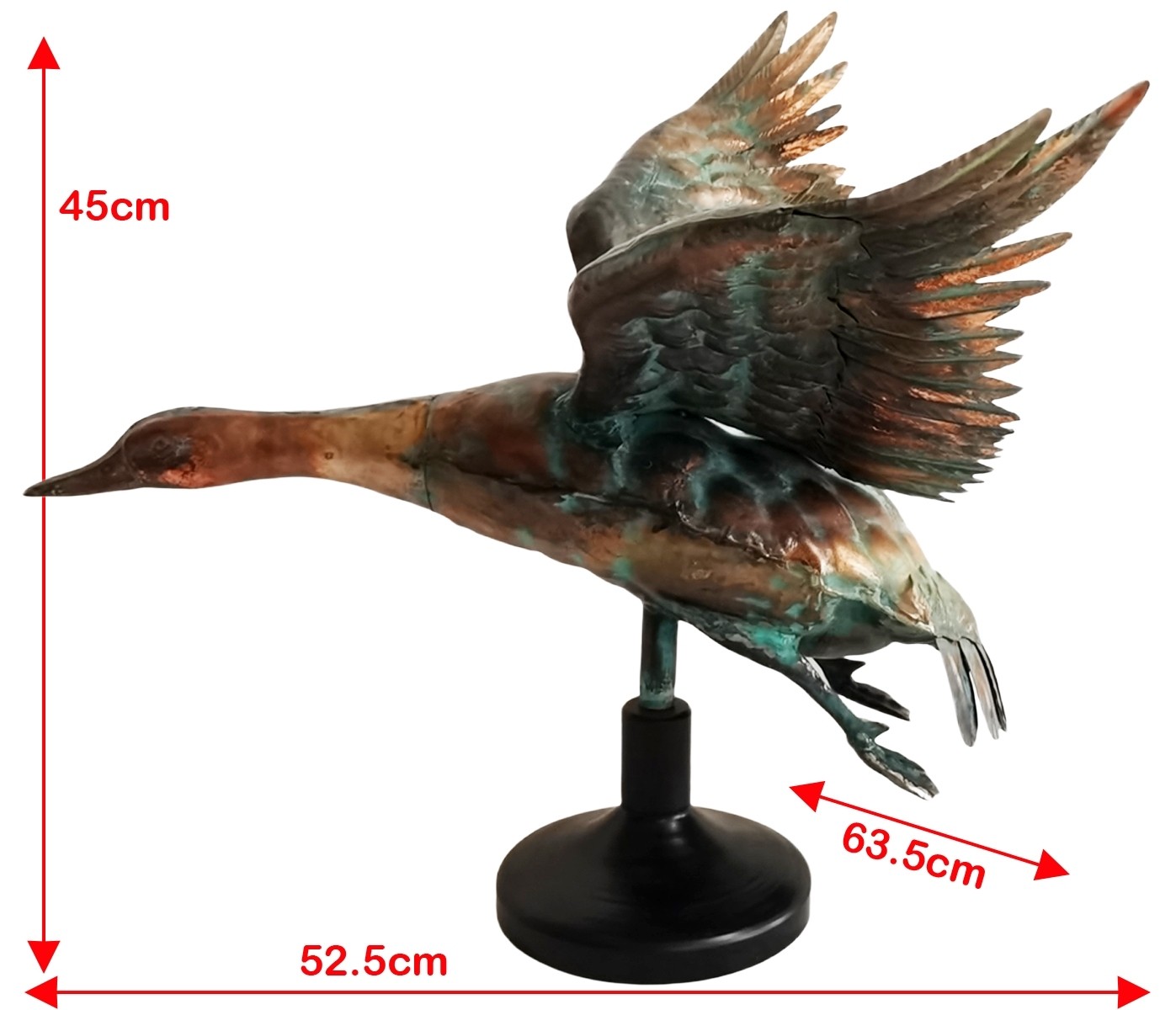 Capture motion and elegance with this 63.5cm Flying Goose Statue, featuring an aged copper and verdigris finish. Crafted in solid metal with a heavy base, it’s a striking decorative piece for any space, adding a touch of rustic charm and sophistication to any décor.”