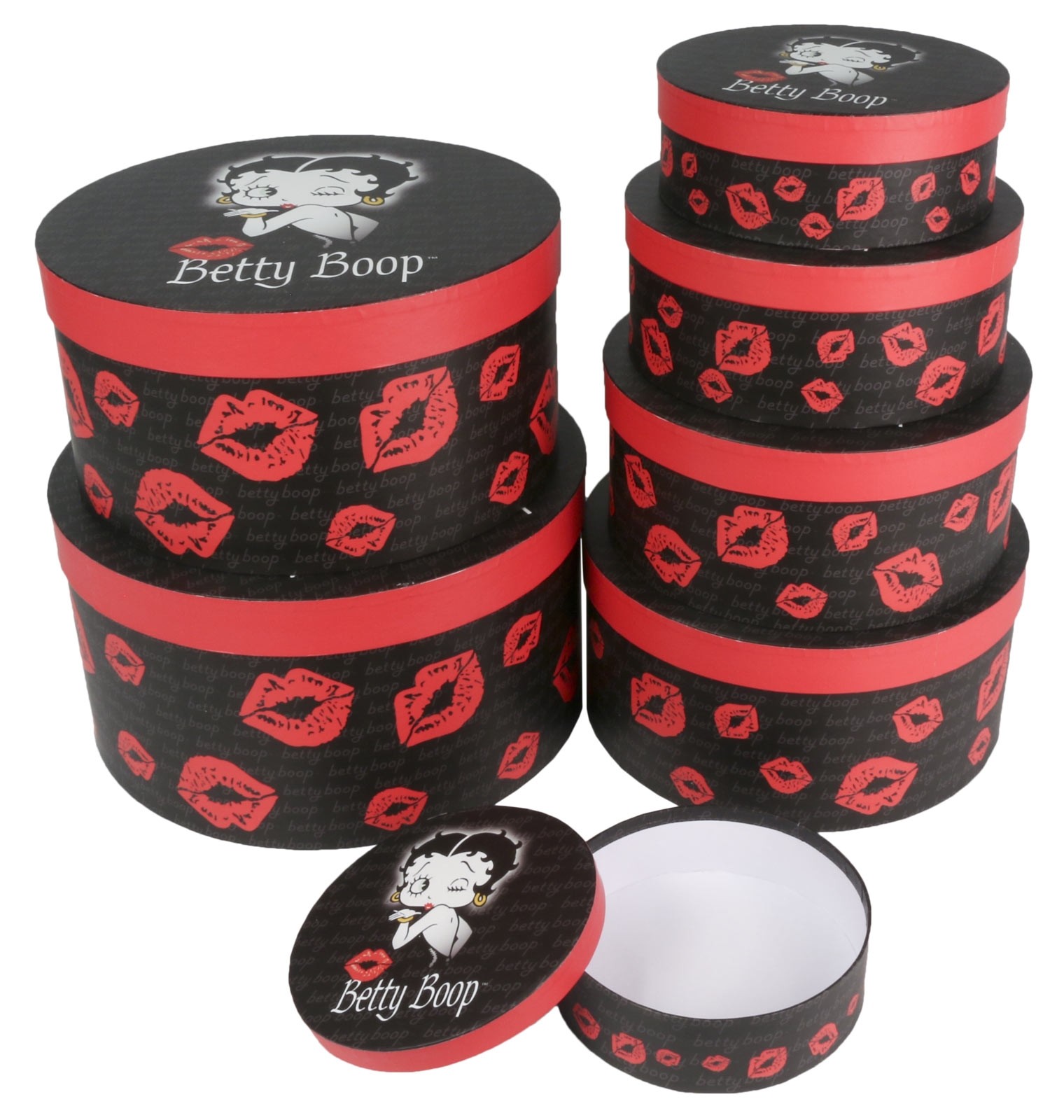 Set of 7 varied sized Betty Boop Round design stiff cardboard storage / gift boxes. Great for storing your jewellery, trinkets, keepsakes – Ideal for Birthday, Christmas gifts.