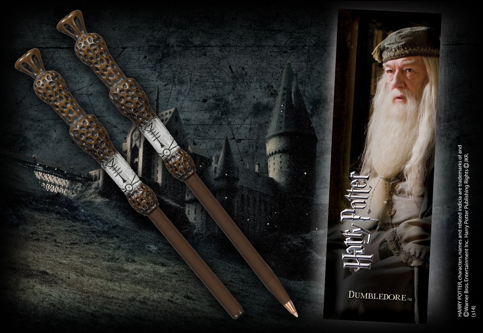 Wand pen in the shape of the Elder Wand and an Albus Dumbledore bookmark.