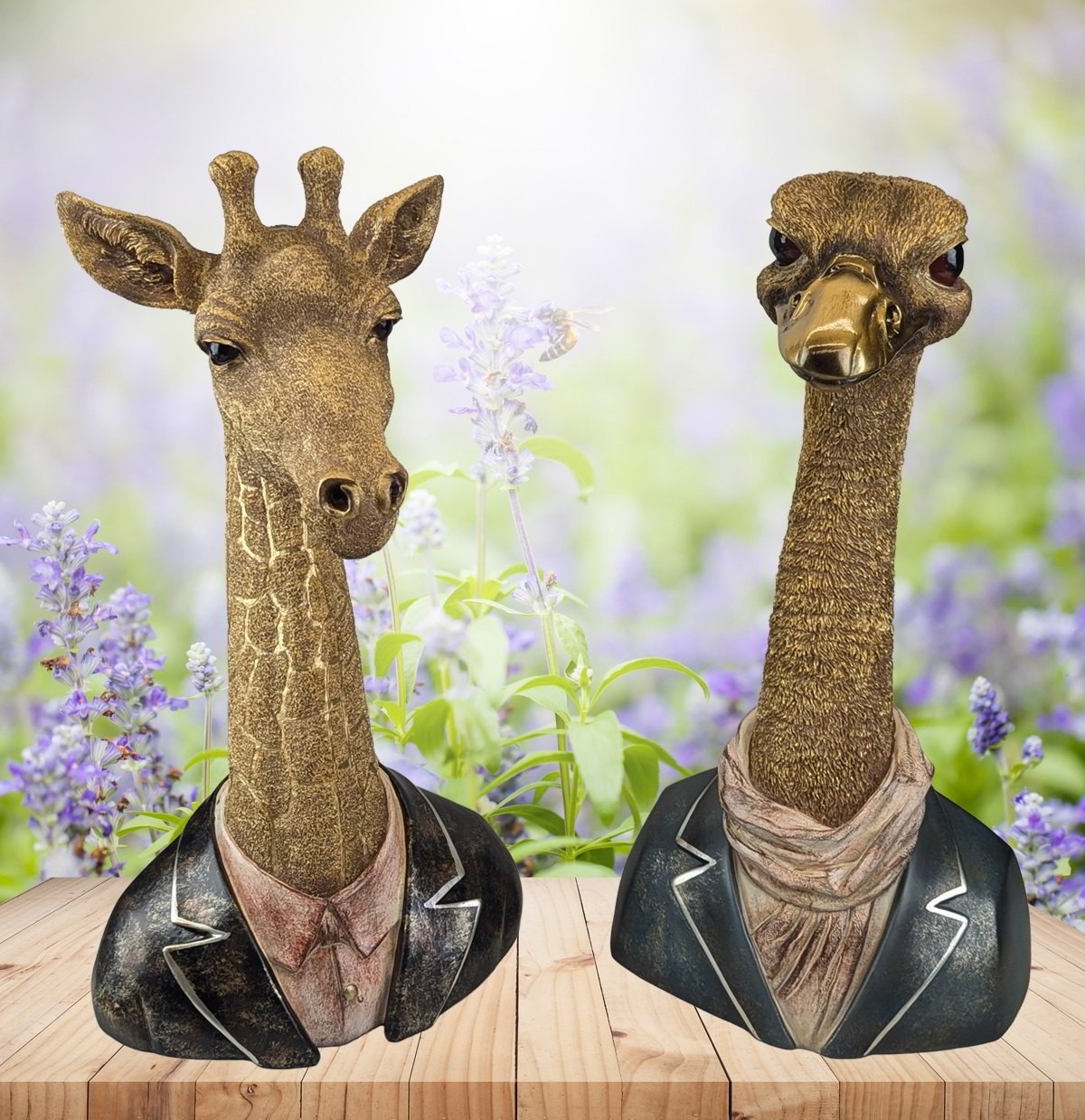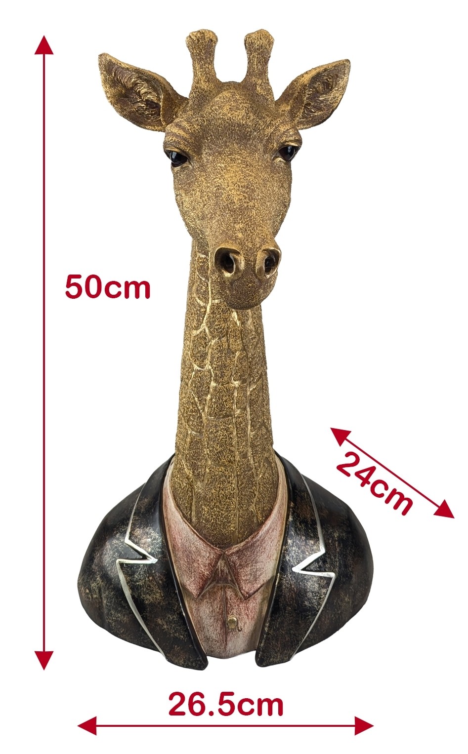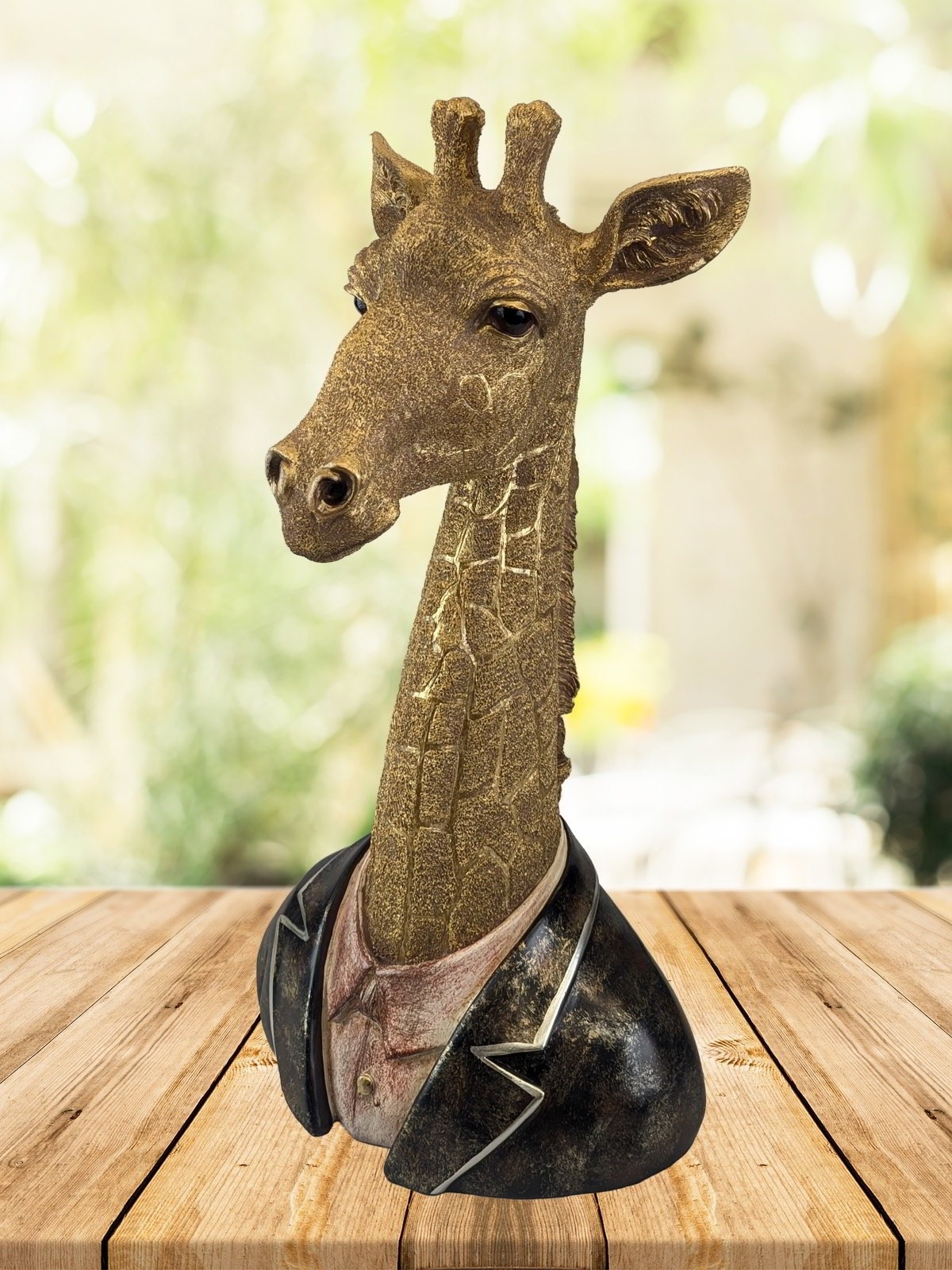 Bring character and charm to your interior with this Giraffe Head and Neck sculpture, standing 50cm tall. Featuring realistic texture, gentle expression, and a stylish jacket and shirt design, it blends wildlife inspiration with contemporary décor. A striking statement piece for shelves, sideboards, or display areas, perfect for adding personality to any room.