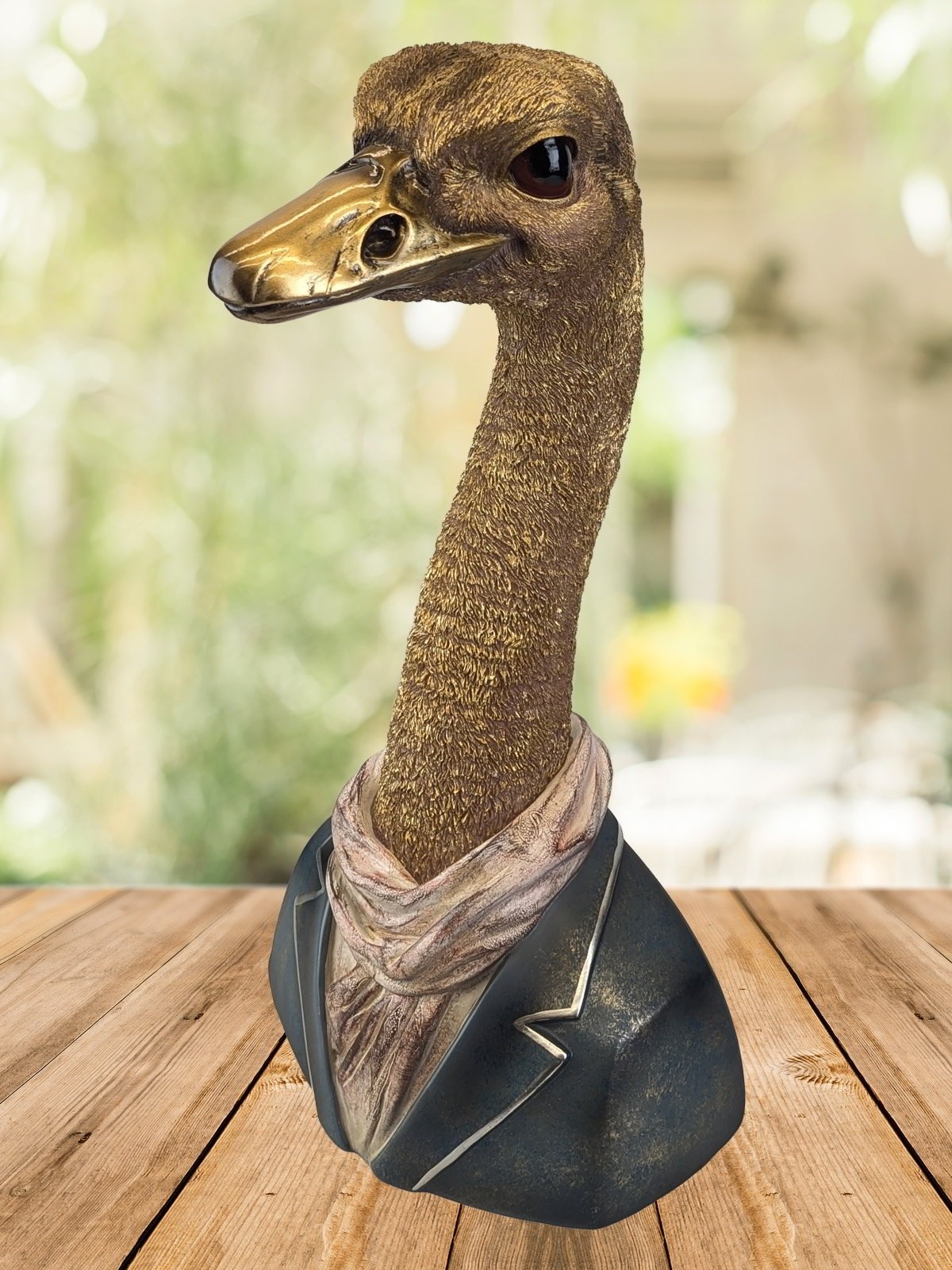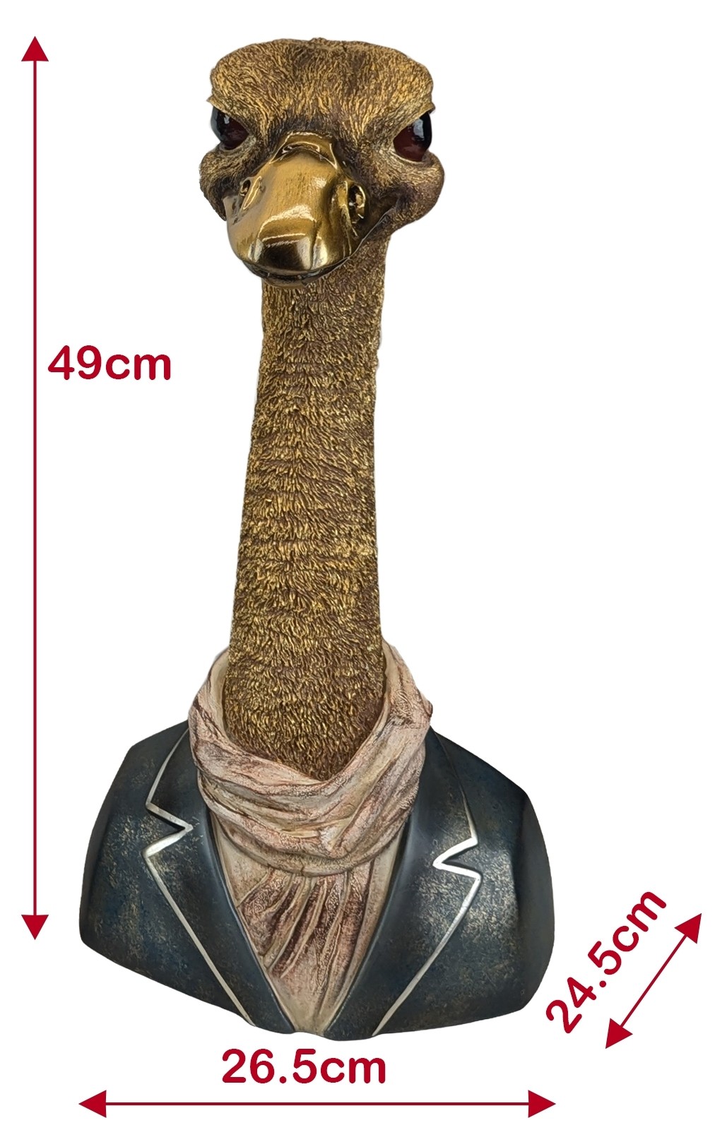 Make a bold statement with this Ostrich Head and Neck sculpture, standing an impressive 49cm tall. Featuring detailed texture and a charmingly quirky expression, the ostrich is styled in a jacket and scarf for a unique, contemporary look. Perfect as a standout décor piece for shelves, consoles, or display areas, it adds character and conversation-starting appeal to any space.