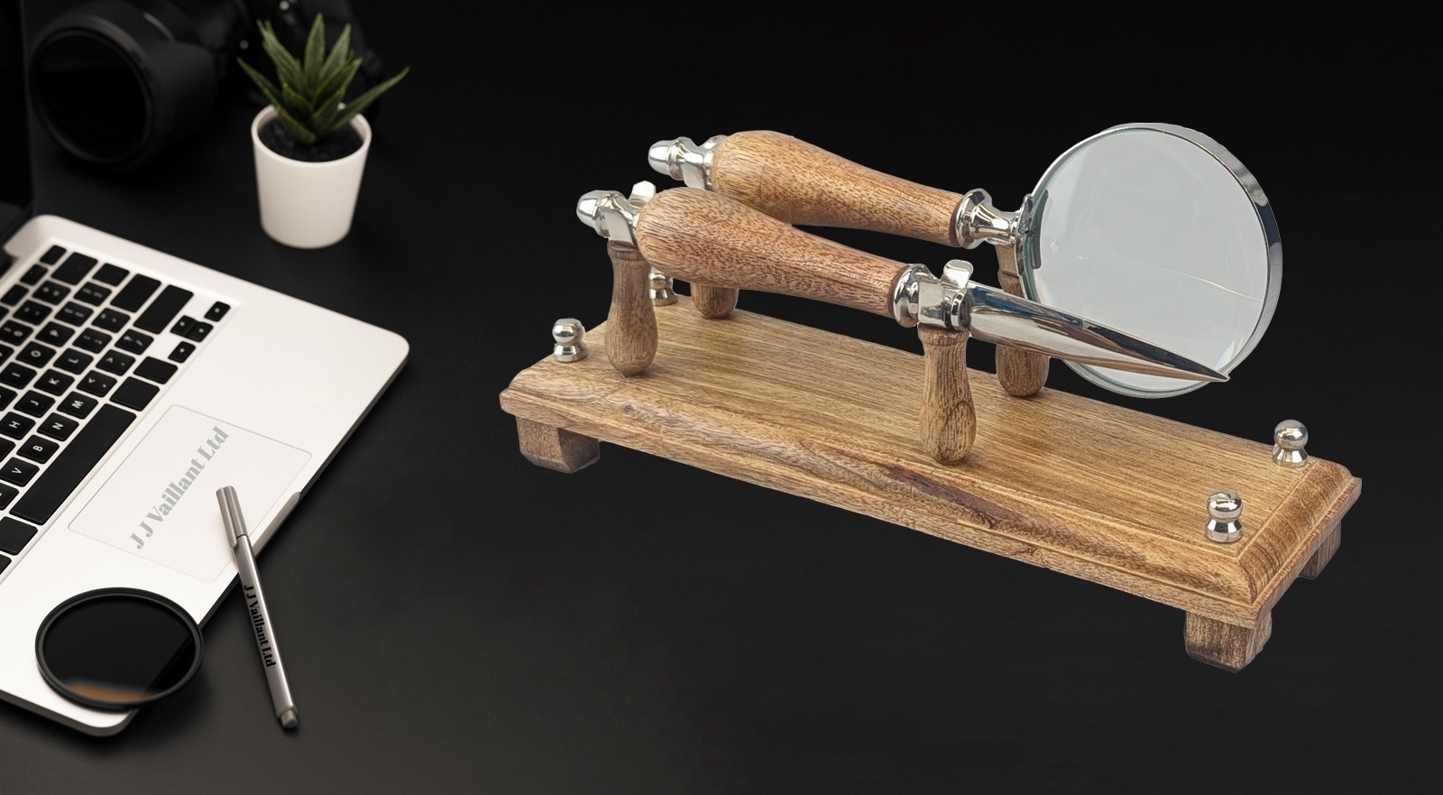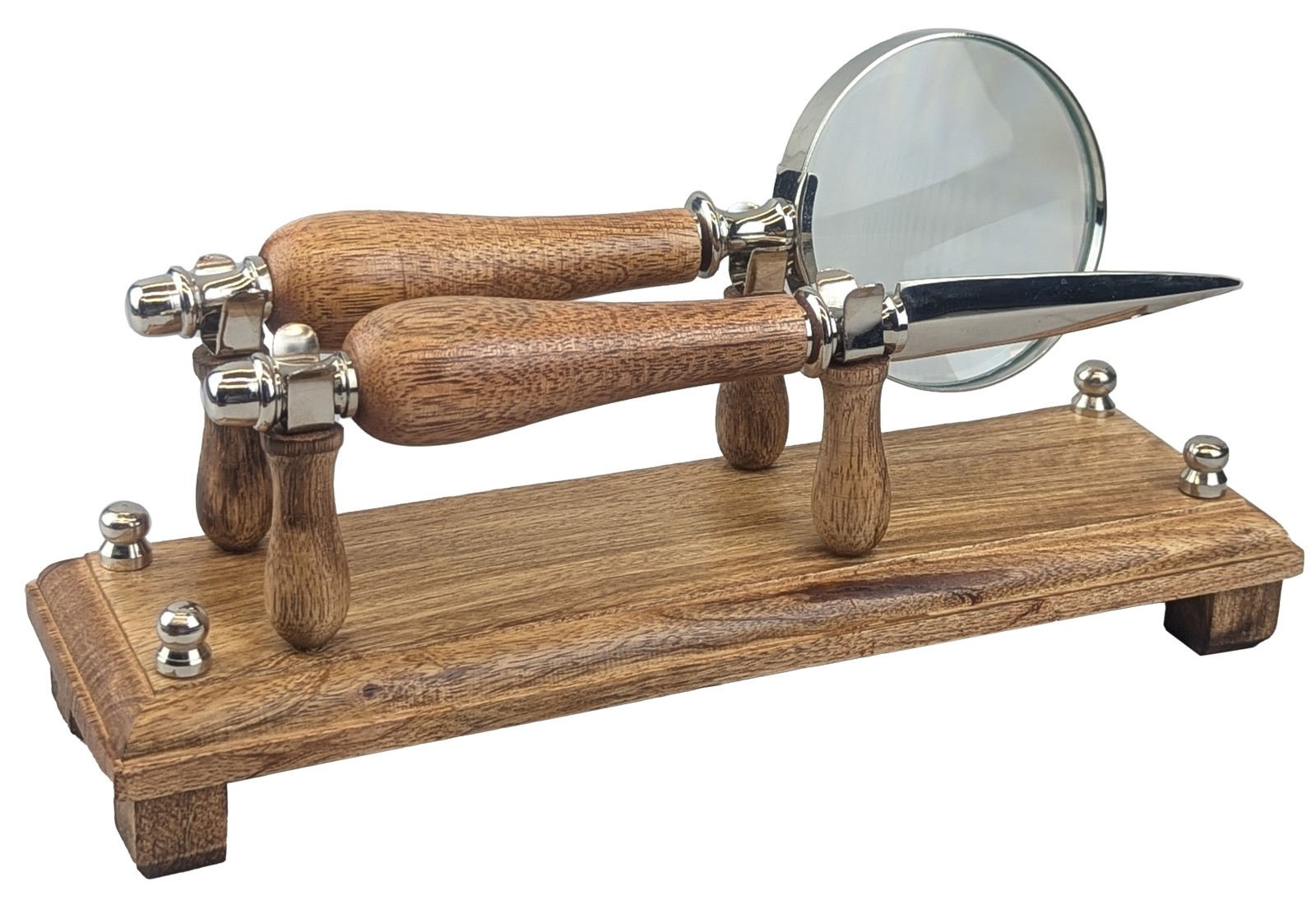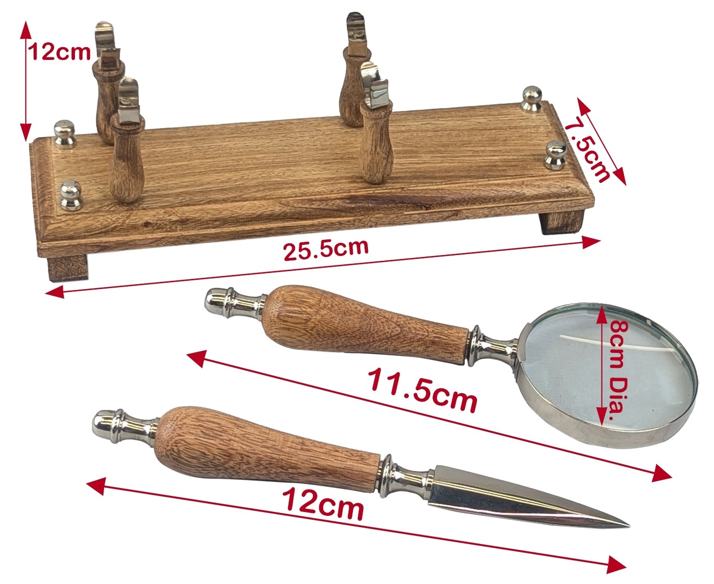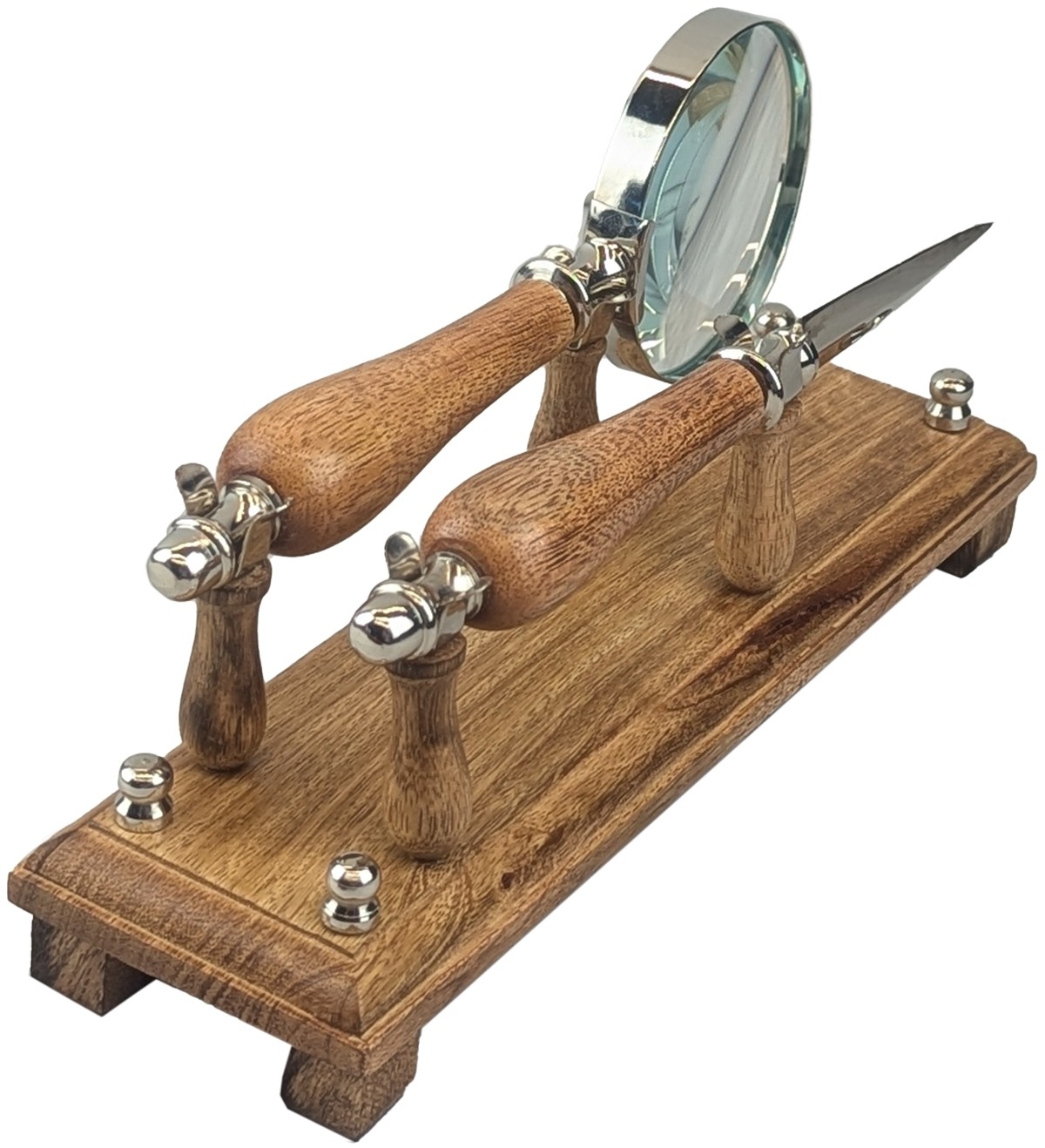 Elegant and practical, this stylish desk set features a nickel-plated magnifying glass and paper knife, both beautifully mounted on a 25.5cm mango wood stand.