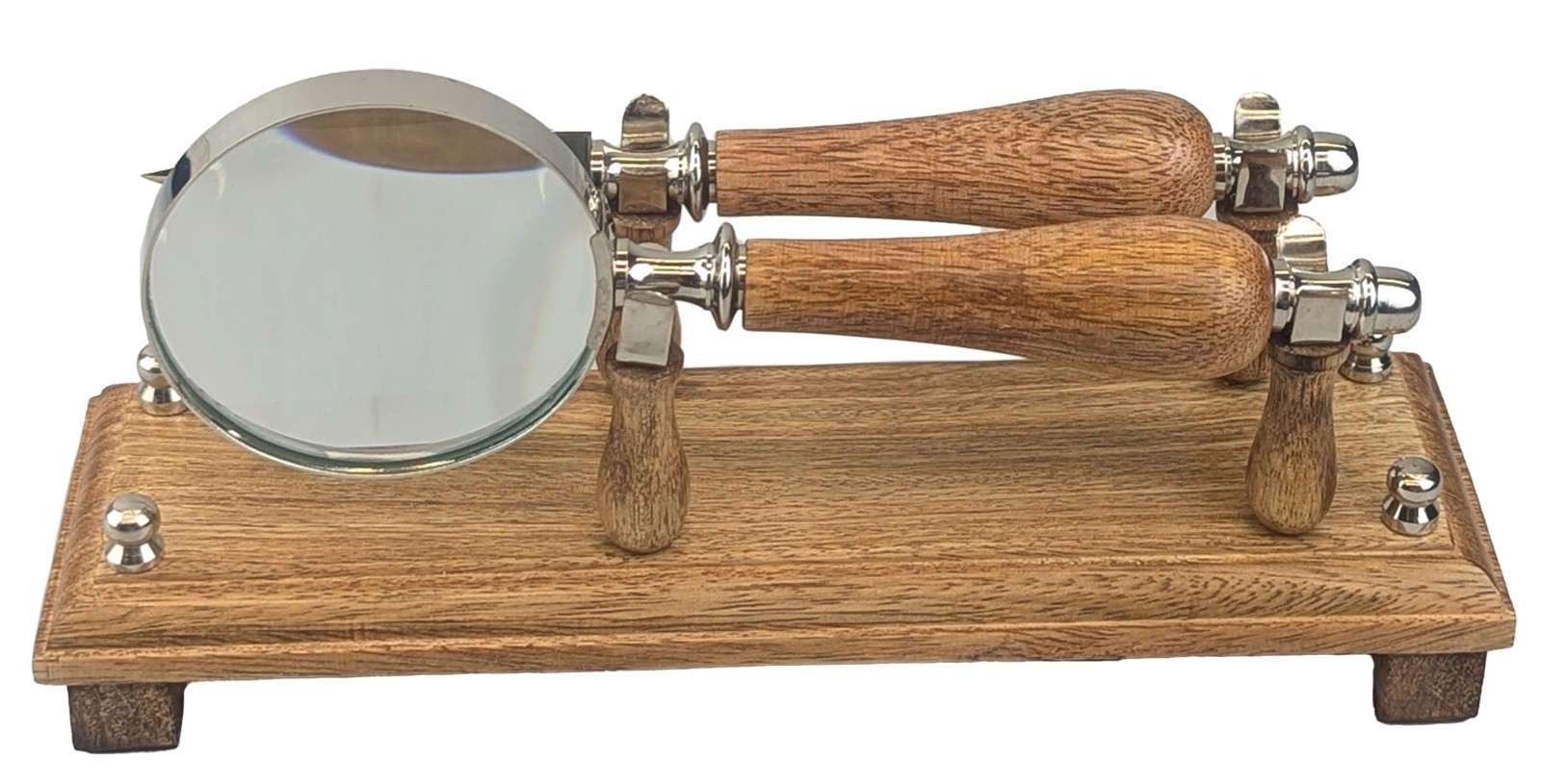 Perfect for home or office, it adds a touch of vintage charm while serving as a functional accessory for reading fine print and opening letters. A thoughtful gift for professionals, readers, or collectors.Item Measurements (cm) Height Width Depth Material Mango Wood / Glass / Nickel Stand / Base 12 25.5 7.5 Assembly Assembled Magnifying Glass - 8 8 Weight (kg) 0.48 - - - - Delivery Cost £4.95* - Next Working Day Just £1 Extra