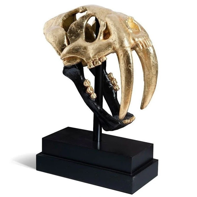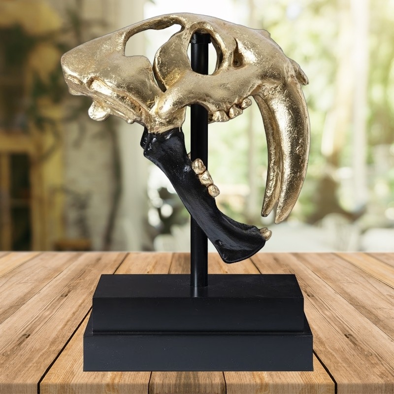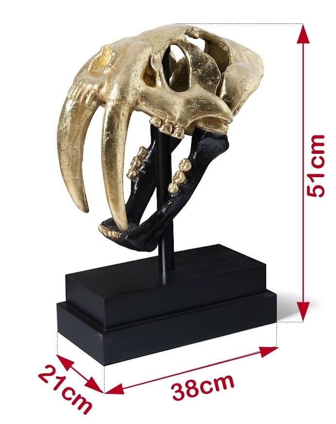 Saber Toothed Tiger Skull on Base - 51cm - Gold With Black Jaw