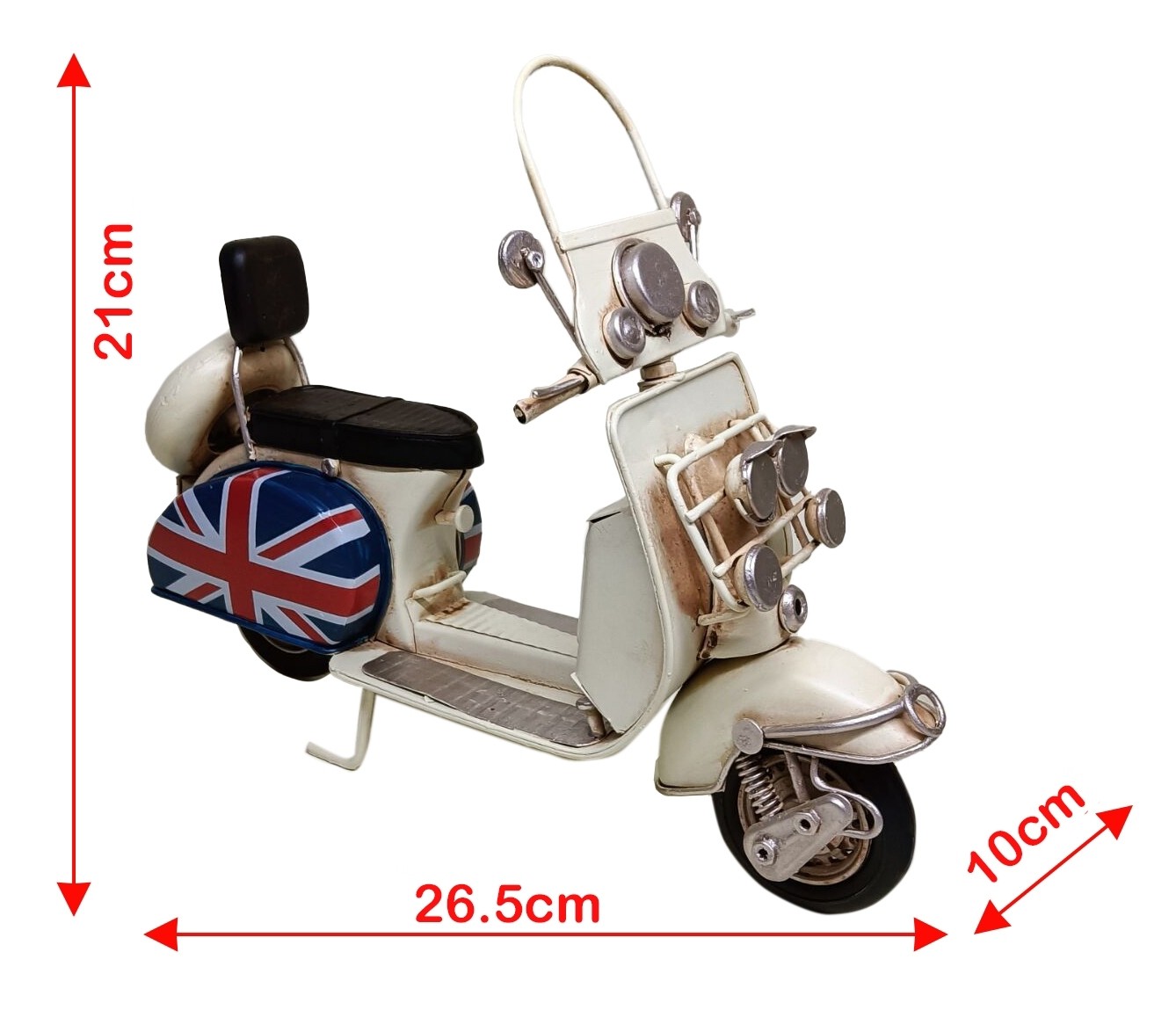 Add a touch of retro charm to your space with this Vintage Metal Scooter Decor. Featuring a classic cream finish, detailed metal craftsmanship, and a bold Union Jack side panel, this miniature scooter brings timeless European style to shelves, desks, or gift displays. Perfect for lovers of vintage décor and travel-inspired accents.