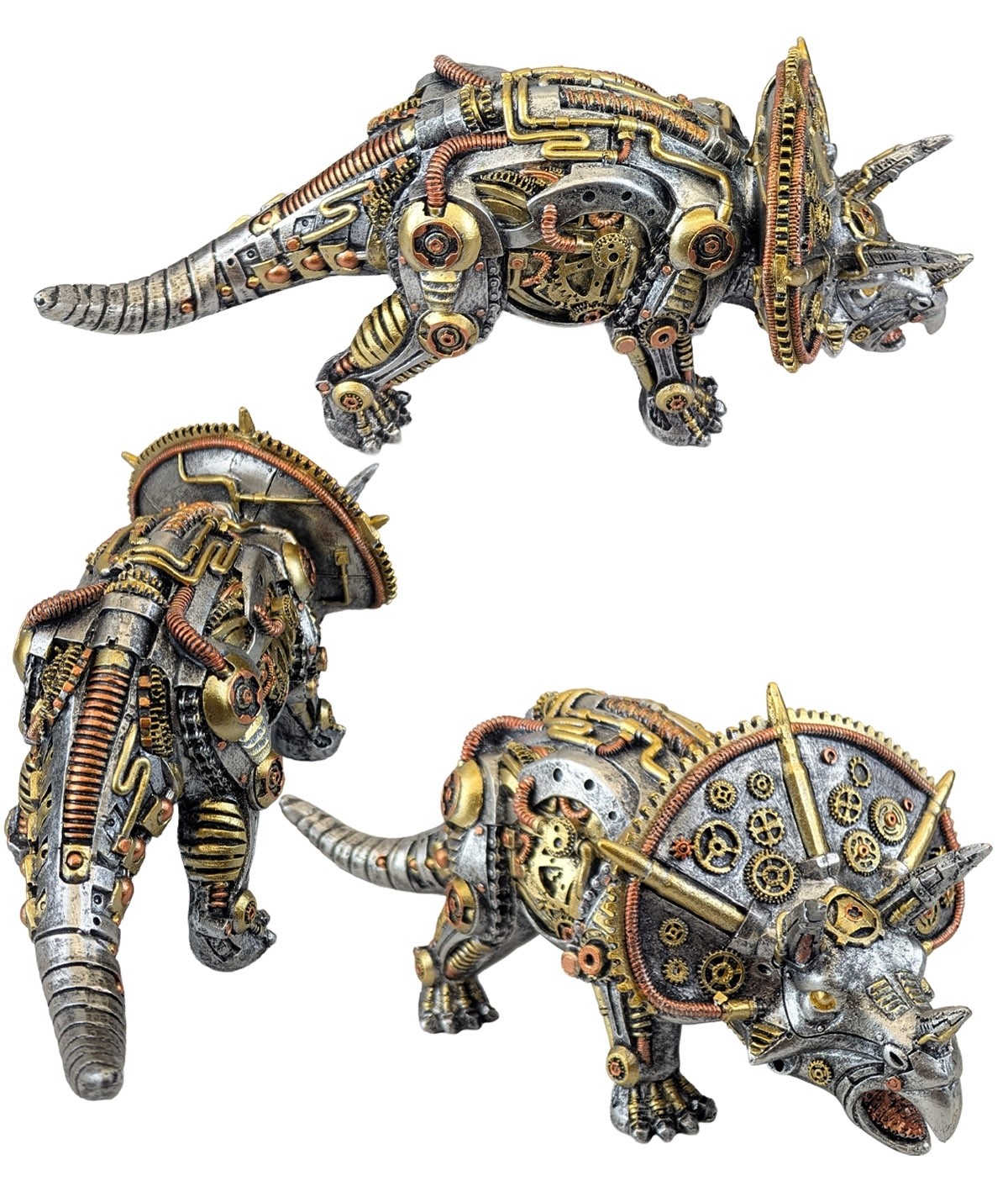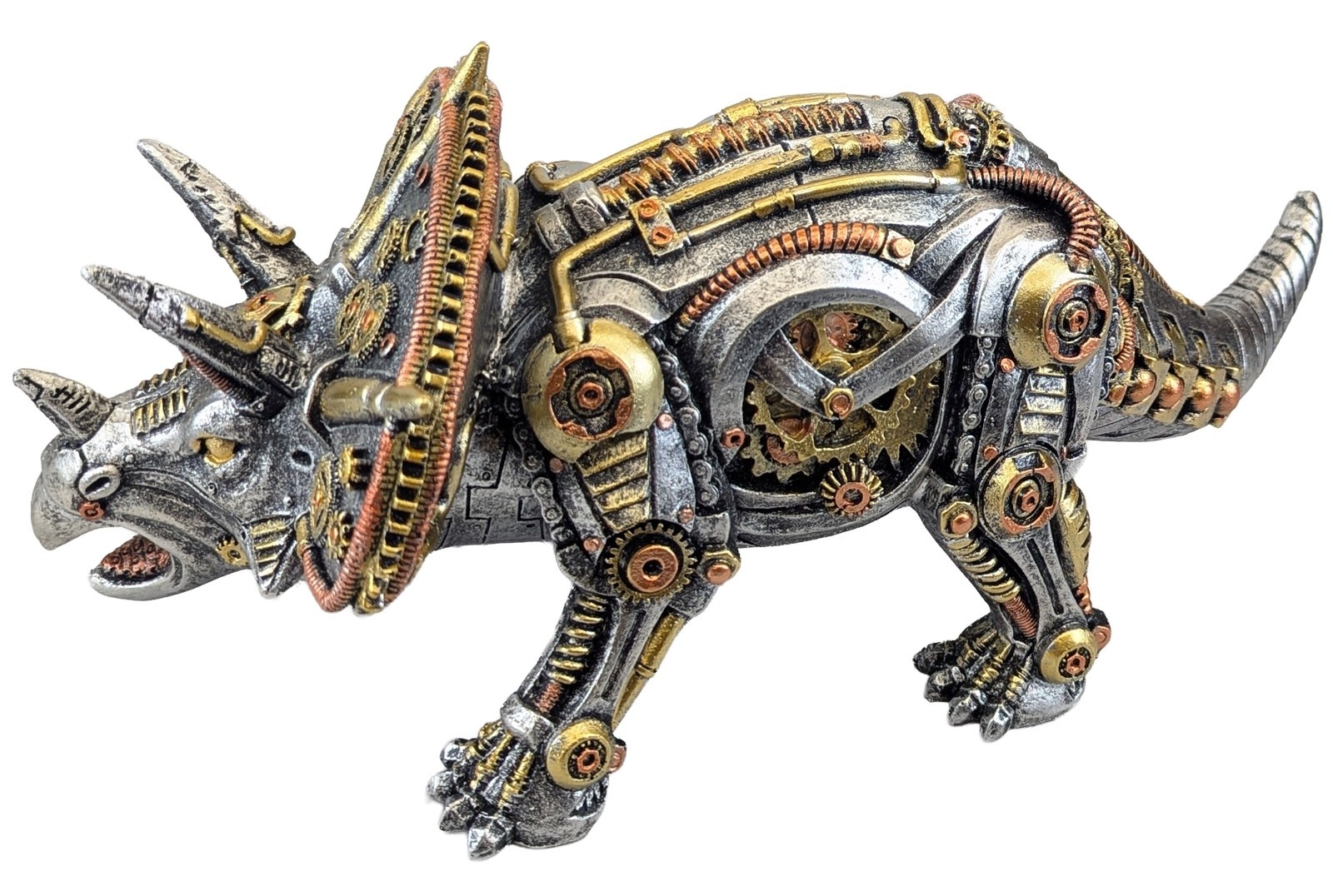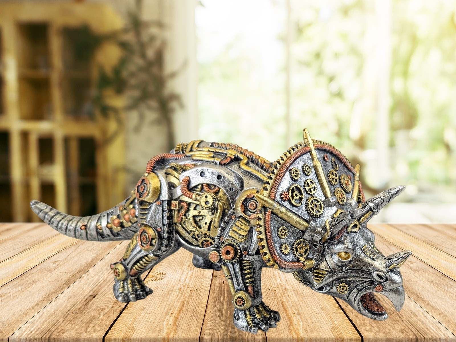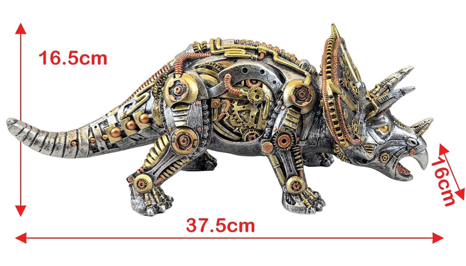 Unleash prehistoric power with a steampunk twist! This 37.5cm Mechanical Triceratops features detailed gearwork, metallic finishes, and an industrial design that brings the ancient beast into a bold new era. A striking decorative piece for dinosaur fans, steampunk enthusiasts, or anyone who loves unique, conversation-starting décor.